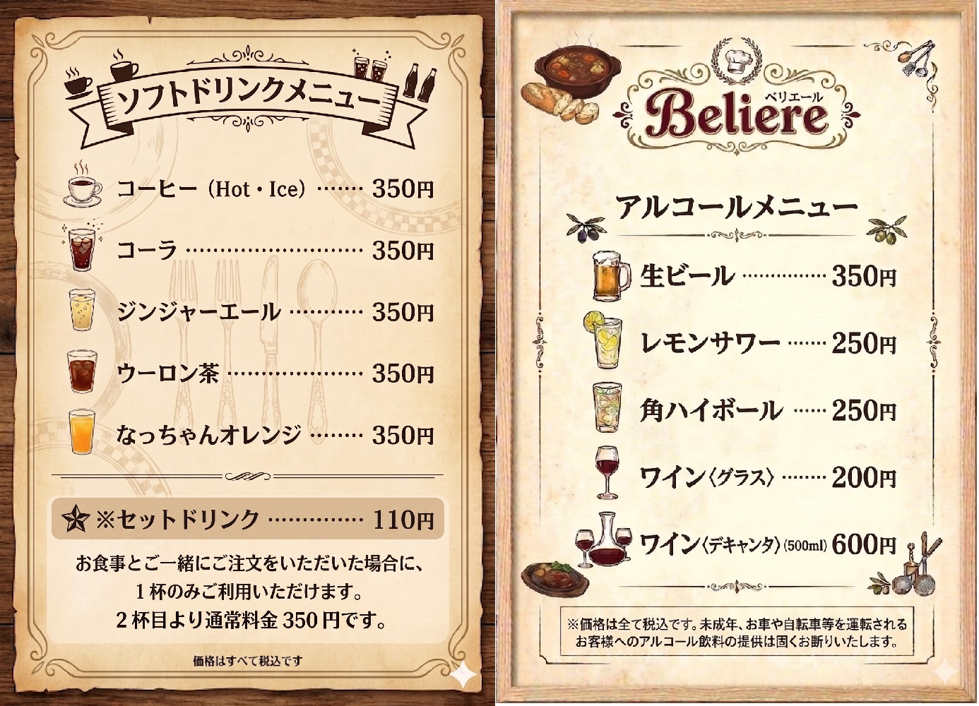 ディナーは、ビール、ワイン、ウイスキー“山崎”や各種カクテルを取り揃え、お酒に合う洋風料理をご提供します。シメはやはり看板ビーフシチューを、是非バケットと共にどうぞ。