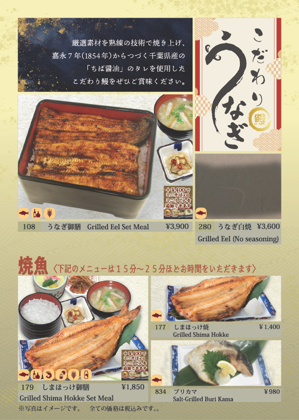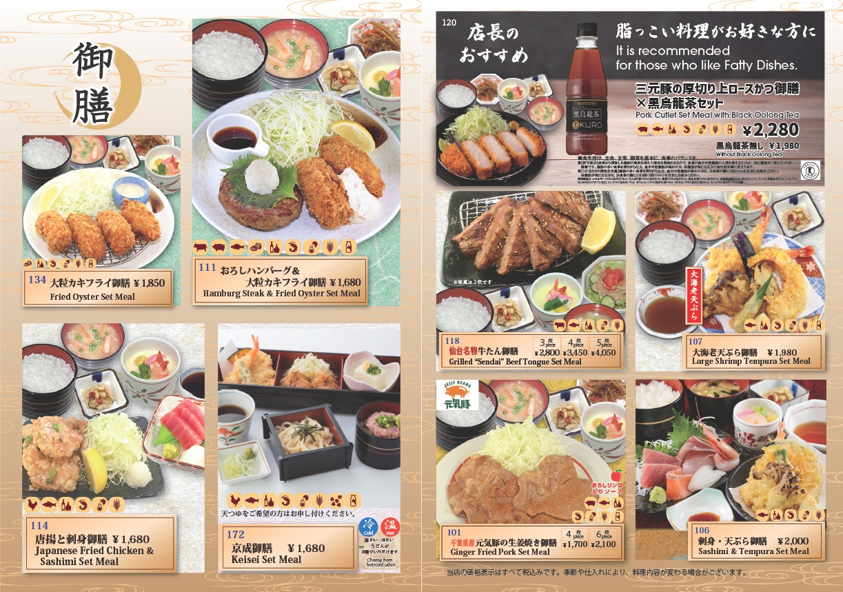 魚、肉料理と天ぷら、寿司、そばの組み合わせによる特色ある定食メニューを取り揃えております。